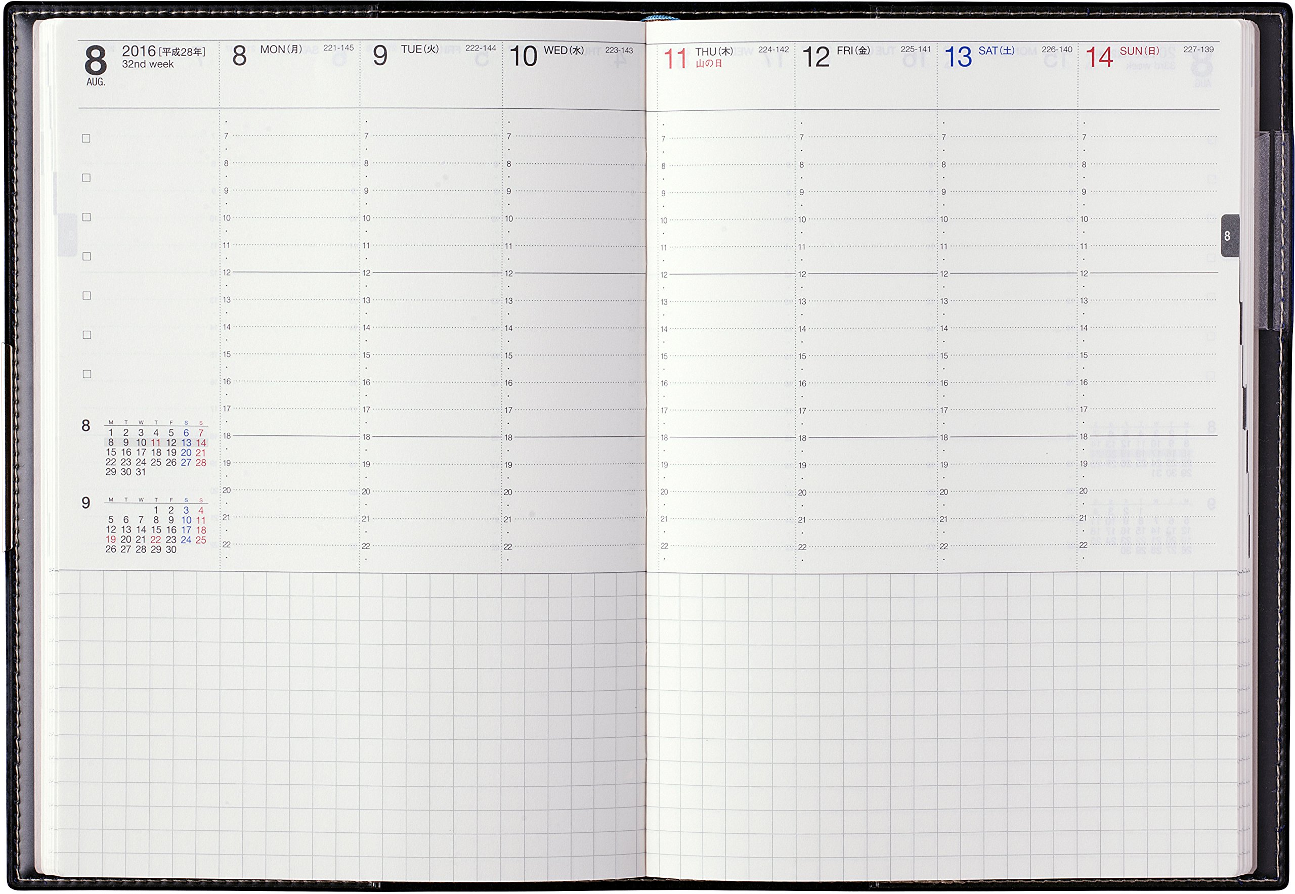 [Satisfaction points] We can check the schedule of a week with a spread. The same capacity is secured on Saturdays and Sundays as well as on weekdays (most of the others are small on Saturdays and Sundays). Since the free entry field under the schedule section is a wide grid, it is easy to memorize. There are many free pages in the second half of the notebook (20P). Pen storage tab is attached. There are three bookmarks. 【Incompatibility】 The cover is hard, especially if it scratches at the corners, it hurts (Daigo is soft so it is not dangerous). 【General Review】 Actively for a week, the daily schedule is easy to fill in, there are many things to take a lot of notes. This type of notebook is very easy to use.