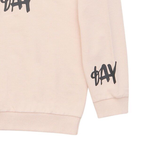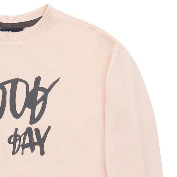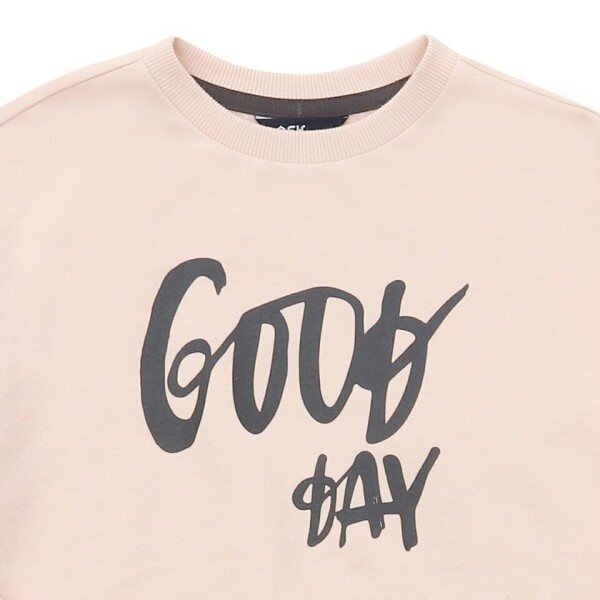 여아용으로 나온 양면 소재의 드랍 소매 라인의 맨투맨 티셔츠.가슴에 필기체 나염을 포인트로 주었고 박시한 핏으로 모든 바지에 잘 어울리는 아이템.