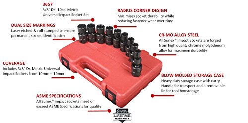 Sunex 3657 3/8-Inch Drive Universal Impact Socket Set, Metric, Standard, 6-Point, Cr-Mo, 10mm - 19mm, 10-Piece