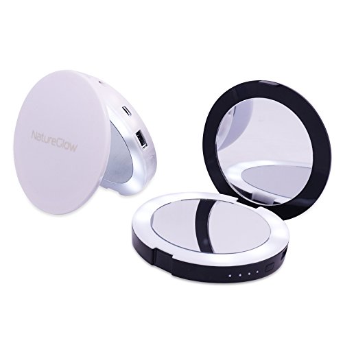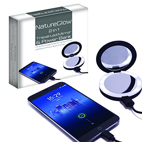 NatureGlow 2-in-1 Portable Travel Vanity Magnifying & Regular Mirror with Led Lights + Portable Charger Power Bank 2200mAh (Black)