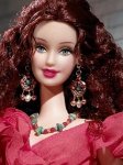 This Bohemian Barbie has long red hair in ringlets with long tendrils down the sides. She wears a pink/orange solid colored blouse with flared short sleeves, fitted bodice with wrap over front and frill down the wrap-over edge. The skirt is full length and fitted to the knees where it flares out considerably. It, too, is a wrap-over style like the blouse, in a pink/orange, turquoise and brown pattern with a frill along the front edge and a peach colored wrap tied partially over the skirt at the waist. Barbie wears high heeled orange/red sandals with ankle straps, and has on earrings and a decoration at the waist in "gold", coral, turquoise and pearl-like materials.