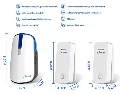 -. Title : Ovikel Wireless Doorbell,Self-power No Battery Required for Both Transmitter and Receiver,Two transmitters with One Plug-in Doorbell.Long working range,Waterproof Push Button,32 Ring Tunes,OV3-2-013R