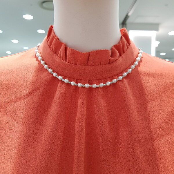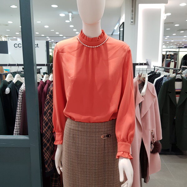 고급스런 진주목걸이 포인트 블라우스예요~기본 정장 블라우스로 어디에나 유용하게 매치해서 입으실수 있어요~오렌지 컬러가 입으시면 얼굴이 환하게 빛나면서 이뿌게 보이실거예요~~