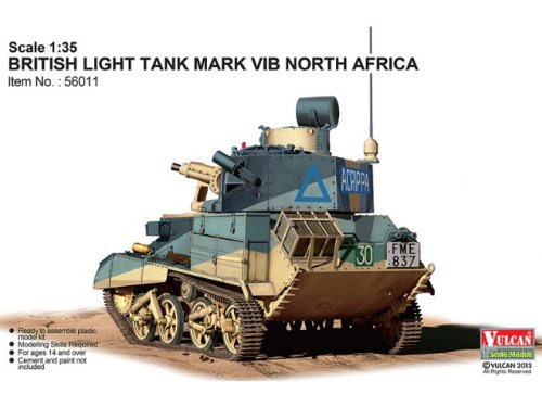 Studio : Vulcan Scale Models Publisher : Vulcan Scale Models Binding : Toy Product Description The Tank, Light, Mk VI was a British light tank, produced by Vickers-Armstrongs in the late 1930's, which saw service during World War II. The Mk VIB was also used in the North African campaign against the Italians late in 1940 with the 3rd Hussars and the 7th Armoured Division. Late in 1940 the British had 200 light tanks (presumably the Mk VIB) along with 75 cruiser tanks (A9, A10, A13) and 45 Matilda II's. An attack by the 3rd Hussars on 12 December 1940 resulted in the tanks getting bogged down in salt pans and severely mauled. 0