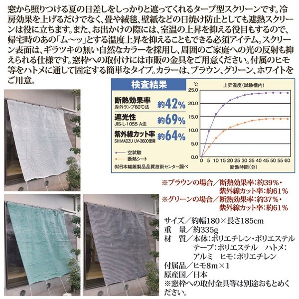 窓から照りつける夏の日差しをしっかりと遮ってくれるタープ型スクリーンです。冷房効果を上げるだけでなく、畳や絨毯、壁紙などの日焼け防止としても遮熱スクリーンは役に立ちます。また、お出かけの際には、室温の上昇を抑える役目もするので、帰宅時のあの「ム~ッ」とする温度上昇を抑えることもできる必須アイテム。スクリーン表面は、ギラツキの無い自然なカラーを採用し、周囲のご家庭への光の反射も抑えられる仕様です。窓枠への取付けには市販の金具をご用意ください。付属のヒモ等をハトメに通して固定する簡単なタイプ。カラーは、ブラウン、グリーン、ホワイトをご用意。