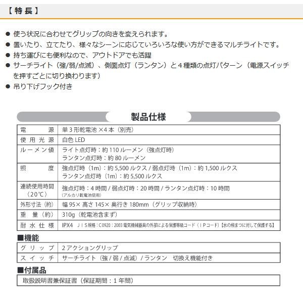fk094igrjs様々なシーンに応じていろいろな使い方ができるマルチライトです持ち運びにも便利でIPX4の防飛まつ仕様なので、アウトドアでも活躍しますサイズ個装サイズ:10×19×15cm重量個装重量:410g製造国中国置いたり、立てたり、色々な使い方ができるマルチライト!!様々なシーンに応じていろいろな使い方ができるマルチライトです持ち運びにも便利でIPX4の防飛まつ仕様なので、アウトドアでも活躍します