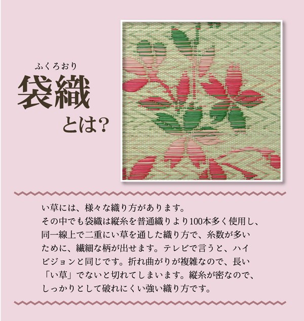 縦糸の本数が多い袋織りという技法で繊細な柄を出しています。折れ曲がりが複雑なので長いイ草を使用しないと切れてしまいます。縦糸が密なので、しっかりとして破れにくいのが特徴です。国産(九州産)のい草を使用しています。一本一本が太く、表皮が厚く繊維がキメ細かいので弾力性があり、耐久性に優れています。い草には空気の自然浄化作用、湿度の調節作用などがあります。また汚れにくく、使用するうちに黄金色に変化し味が出ます。い草に青森ヒバ加工を施しています。(抗菌、防臭効果)