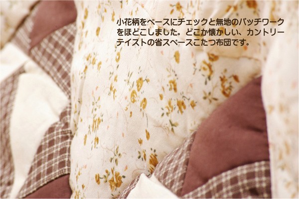 カントリー調の明るい柄のこたつ布団です。裏地には軽量で、保温性の高いフリースを使用しています。省スペースタイプで角が膨らまず、お部屋を広く使えます。薄手なのでかさばらず、コンパクトに収納できます。部分暖房のコタツは電気代もおトクです。