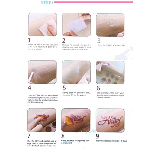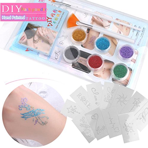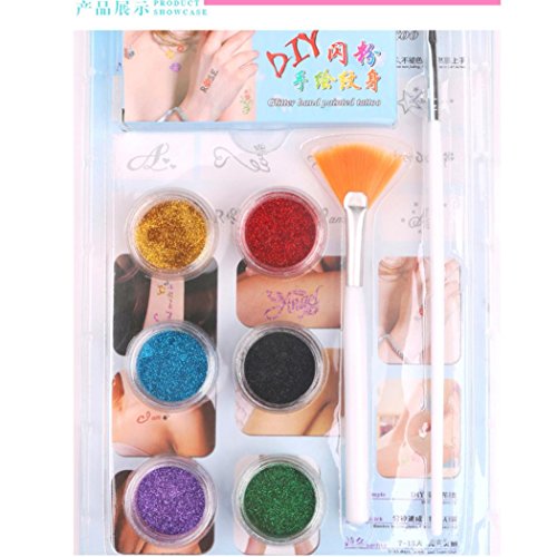 -. Feature : Parcels include: 1, tattoo glitter *6 bottles (Random Color) 2, brush * 2 3,12 pattern tattoo templates / Different Durability.Daily activities, easily friction to the site, such as the hands, inside of your wrist, neck, can keep 3 to 5 days.Other parts for 6 to 7 days under normal circumstances, the ankle may keep more than 1 week. / Nightclubs & Beach & Party & Outing & Wedding. It only need 1 minute to help you distinctive. / It can better integrate with the Plastic, Ceramic, Metal, Cloth, Glass surface. It can present more vivid colors, less likely to be scraped off, and keep longer time. / What could not be better is that the tattoo stickers can be affixed to the back of the phone along with a transparent protective shell.