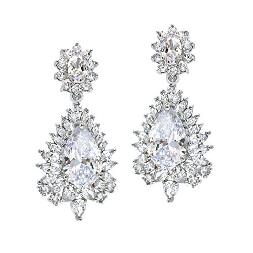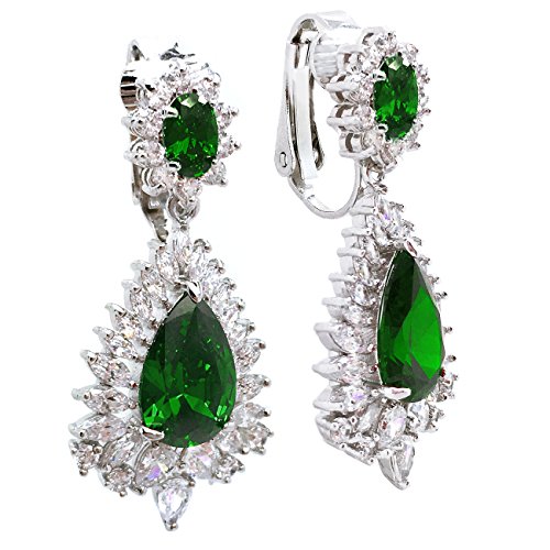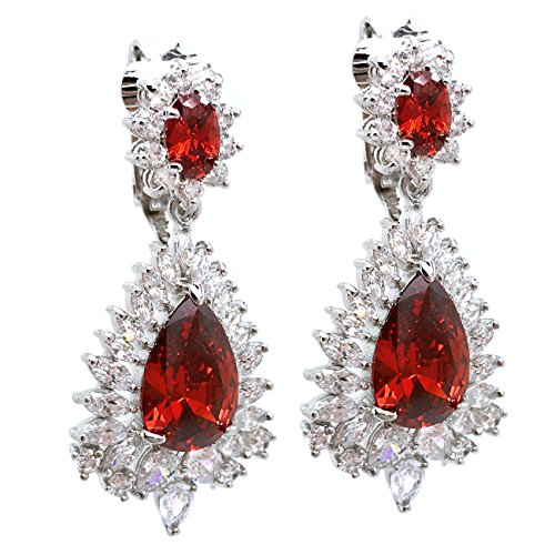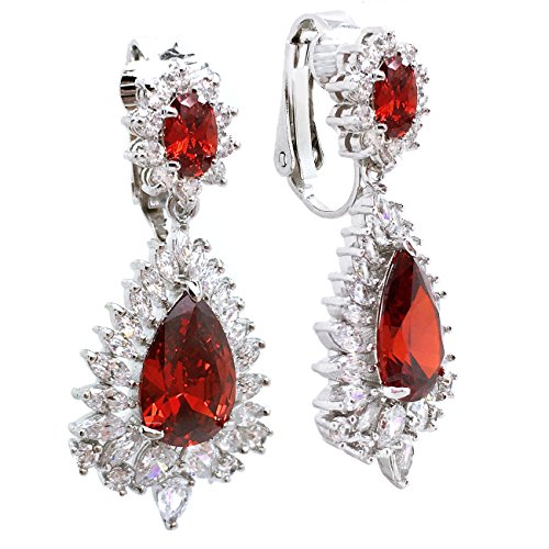 Made of rhodium plated brass, these sparkling dangle earrings are sure to dazzle everyone. Featuring a fabulous pear shaped red centerstone while flanked by cluster of clear marquise and round CZ stones. Clip on backings secured these earrings. For Non Pierced Ears. These lovely earrings will make the perfect choice for your special someone for Valentine's gift, Christmas gift, Mothers day gift, Birthday gift, Anniversary Gift, or Bridal party gifts.Feature