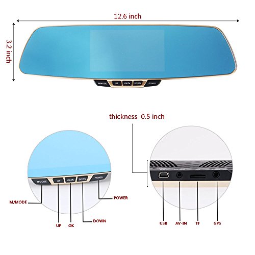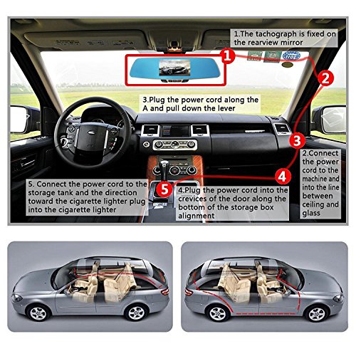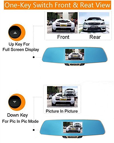 -. Feature : ▲ Seamless Video Recording: Automatic seamless video recording in loop to use the storage efficiently, with the earliest unlocked video clips being overwritten when reaching the storage card's maximal capacity. Customizable video clip length of 2, 3 and 5 minutes. / ▲ Picture-in-picture Display: The Front view and rear view videos are displayed on the screen in a picture-in-picture appearance. One-button switch can toggle the display of the two views in either the full screen or the inset window respectively, or turn off the picture-in-picture display. / ▲ Dual-lens Camera Design: The front camera has a 170 degree viewing angle to ensure you have all angles covered to record. When connected to the backup camera, automatic backup monitoring will be triggered to show on the display screen at the same time of backing up the vehicle. / ▲ One-button audio recording on/off for privacy protection concerns. One-button picture taking, one-button emergency video recording and locking. Customizable automatic display off while recording for energy saving. One-button switch can toggle the display of the two views in either the full screen or the inset window respectively, or turn off the picture-in-picture display. Manually adjustable brightness, contrast, white balance settings. / ▲ Ignition detection and crash detection: The device is automatically turned on and recording when the engine starts, and automatically turned off shortly after the engine is off. When in the motion detection mode, if the lens detects any motion, the device starts video recording automatically, and will stop video recording shortly after the lens does not detect any motion. Highly-sensitive G-sensor powered automatic video recording and video file locking when a collision or crash is detected.