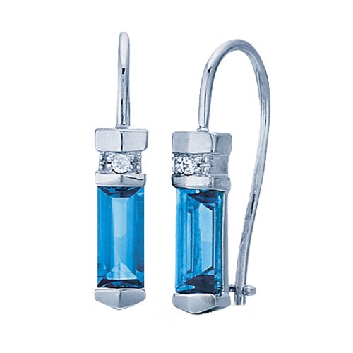 A thoughtful look for the December birthday girl, these sterling silver fashion earrings each showcase a 7X3mm buff top baguette Swiss blue topaz and diamond accent. Fishhook finding allow for a delicate dangle.