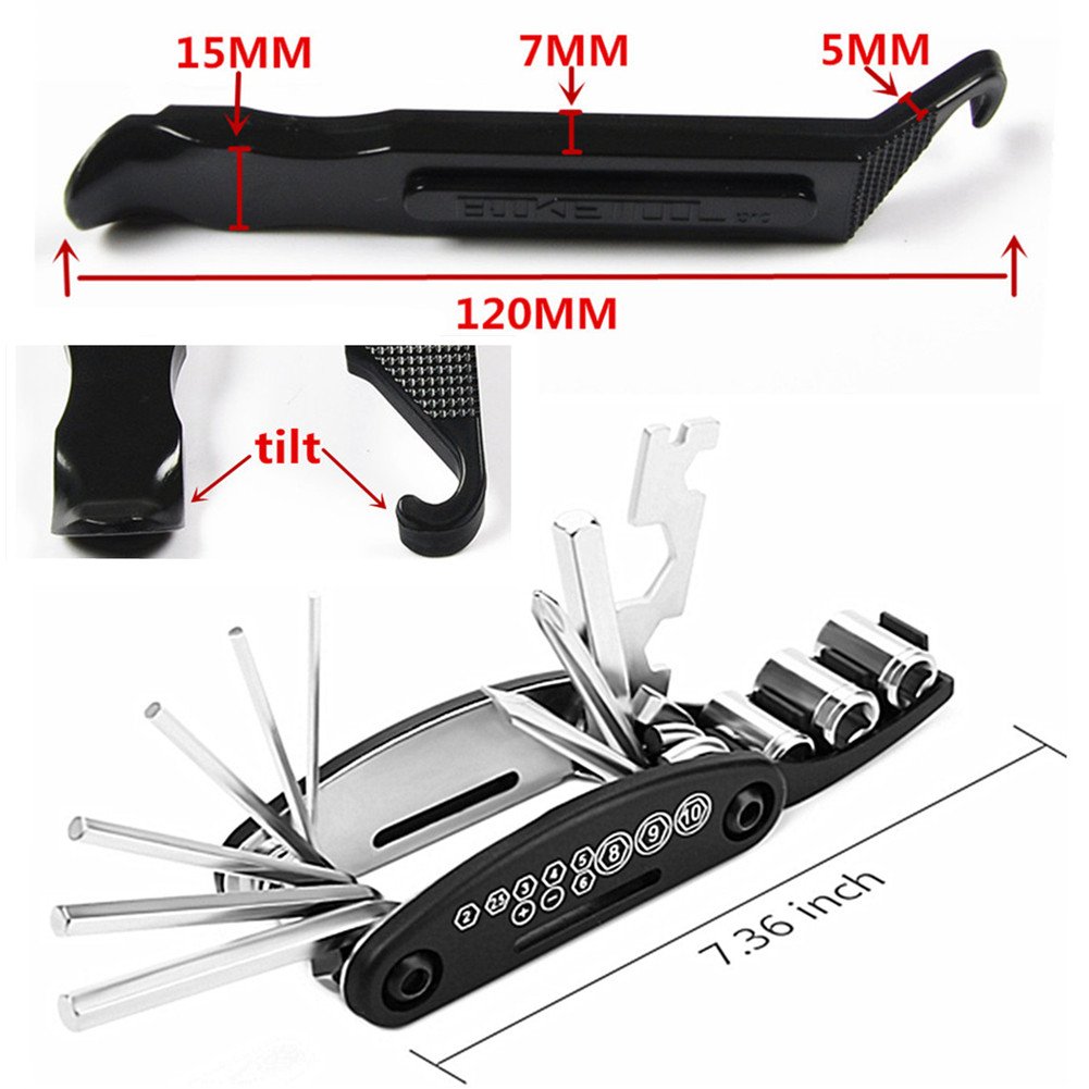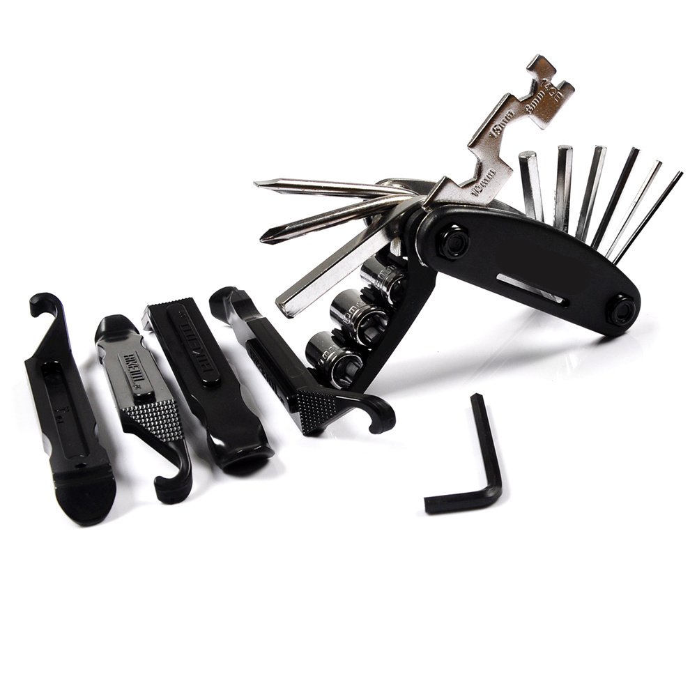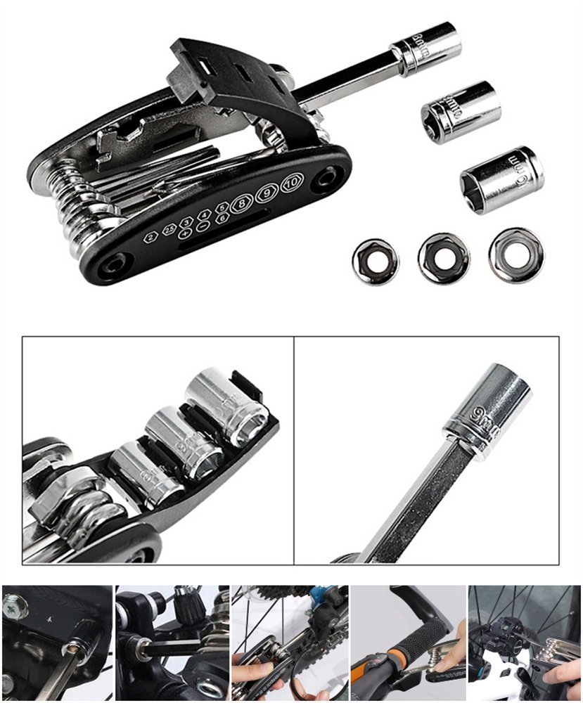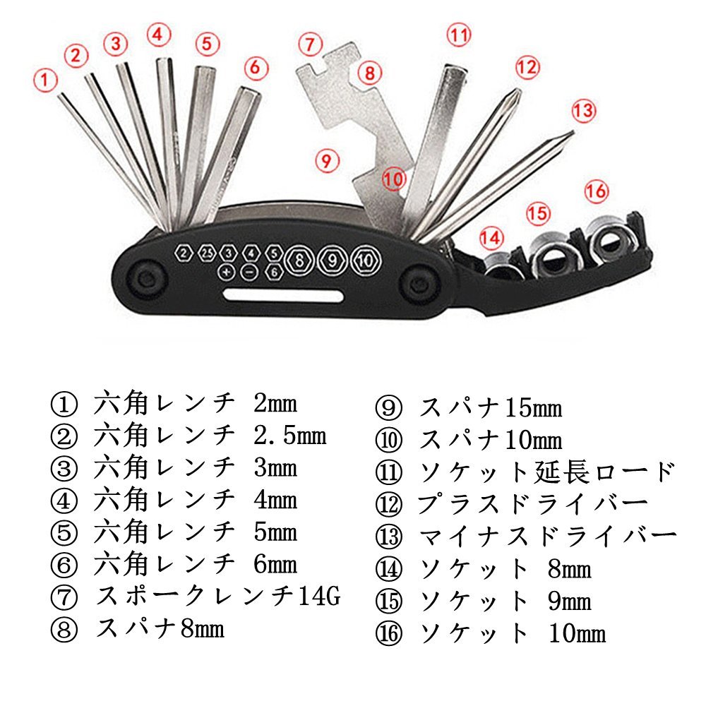 【16 in 1 integrated】 Hexagon wrench 2 / 2.5 / 3/4/5/6 mm, socket 8/9/10 mm, socket extension load, spanner 8/10/15 mm, Phillips screwdriver, flathead screwdriver, spoke wrench 14 GE.