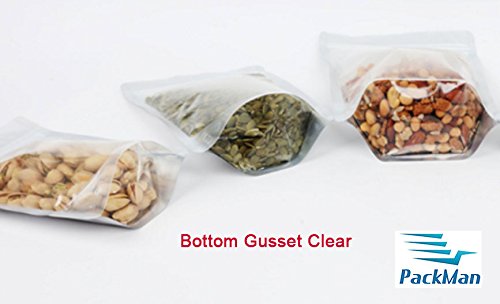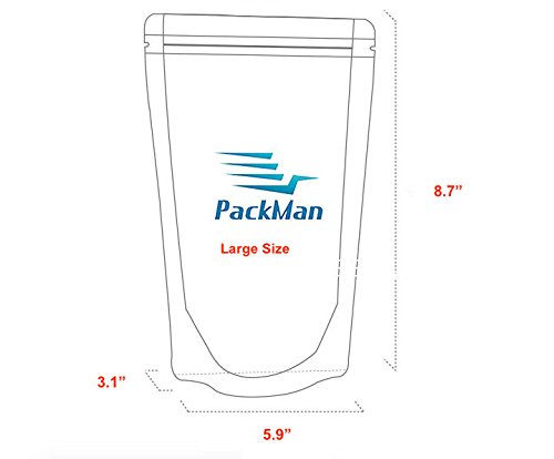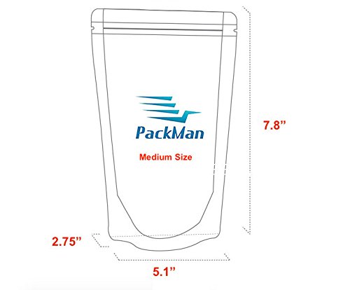 Dimensions: Medium Size - 5.1" X 7.8" + Bottom Gusset 2.75" / Large Size: 5.9" X 8.7" + Bottom Gusset 3.1" / Thickness 4.7 MIL / Storage Capacity: Medium Size - 11.8 Fluid oz (350ml); 80~150g / Large Size - 16.9 Fluid oz 500ml); 150~250g