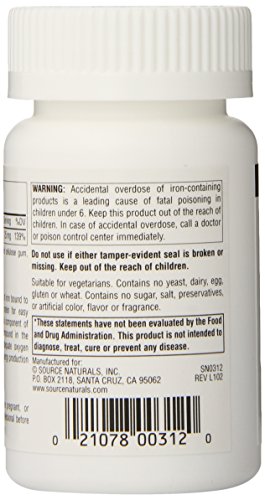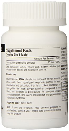 ReleaseDate : 2015-07-16 Studio : Source Naturals Publisher : Source Naturals Binding : Health and Beauty Product Description Source Naturals Iron chelate is composed of iron bound to amino acids from hydrolyzed vegetable protein for easy assimilation and utilization. Iron is a critical component of hemoglobin, the main oxygen-carrying compound in the blood, and therefore a prerequisite for adequate oxygen supply to the cells. Iron is also required for energy production and collagen synthesis. 0