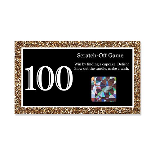 -. Feature : Adult 100th Birthday - Gold - Birthday Party Game Scratch Off Cards - 22 Count / Each game has 2 "winner" cards and 20 "loser" cards / Cards measure 2.75" tall x 4.75" wide / Cards are P.R.Inted on heavy card stock with the game on the front and a pattern on the back. Made in the USA / Please note, this is faux glitter - it's P.R.Inted to look like glitter, but it is not real glitter.