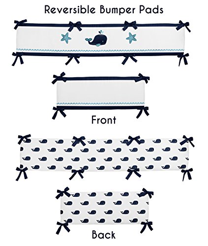 -. Feature : 9 Piece Set Includes: (1)Crib Blanket, (1)Bumper, (1)Fitted Sheet, (1)Skirt, (2)Window Valances, (1)Diaper Stacker, (1)Toy Bag and (1)Throw Pillow / **Sweet Jojo Designs also offers an 11 piece bumperless set / This set features detailed whale and ocean themed appliques with ric rac ribbon accents, a coordinating chevron wave P.R.Int and a delightful mini whale P.R.Int. / This set is made of cotton, brushed microfiber and microsuede and is machine washable / This design has matching accessories such as window treatments, hampers, shower curtains, memory photo boards, body pillow cases and decorative pillows.