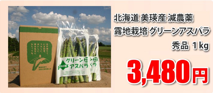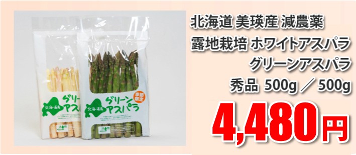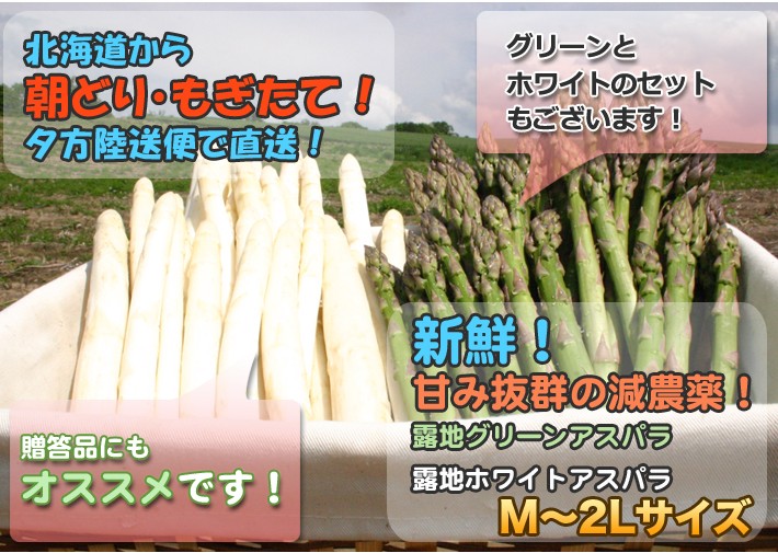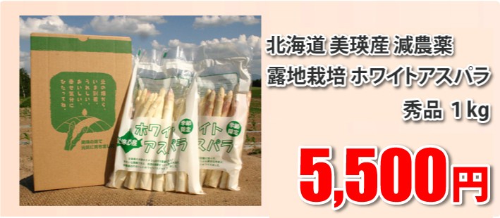 | 商品内容 | 北海道美瑛産減農薬露地栽培ホワイトアスパラガス 1kg秀品(M~2Lサイズ)化粧箱入り(500g×2パック) ◎楽しい簡単レシピ付き |