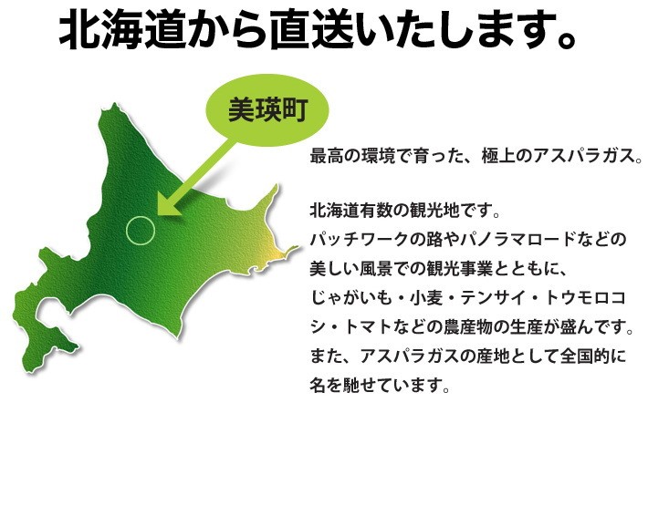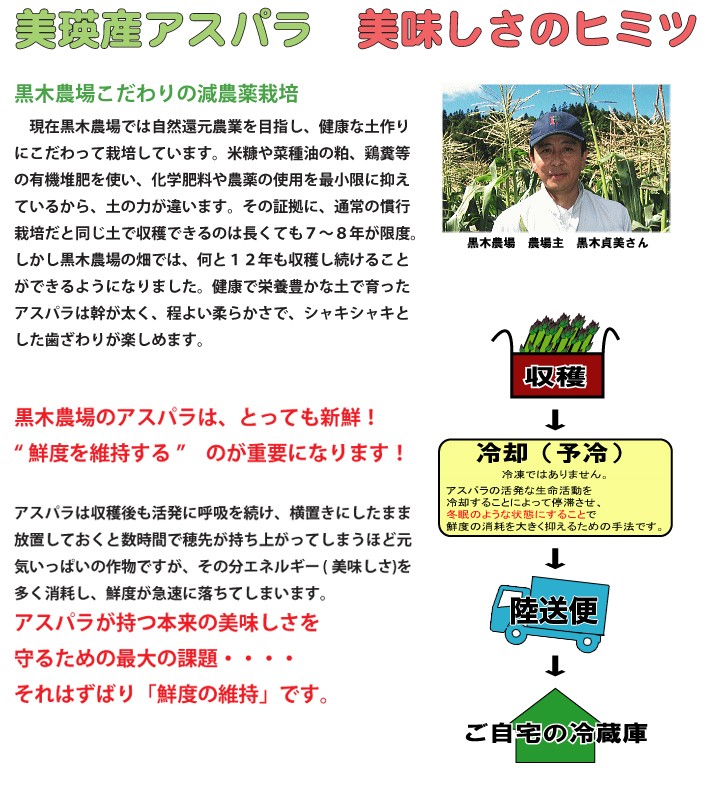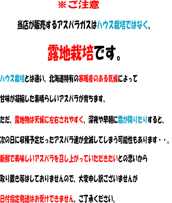 | 同梱について | こちらの商品は産地直送となるため、 アスパラガス以外の同梱でのご注文はできません。 |