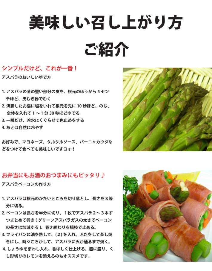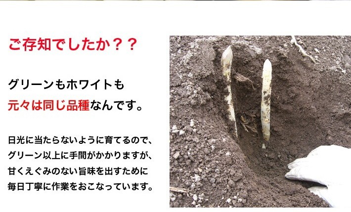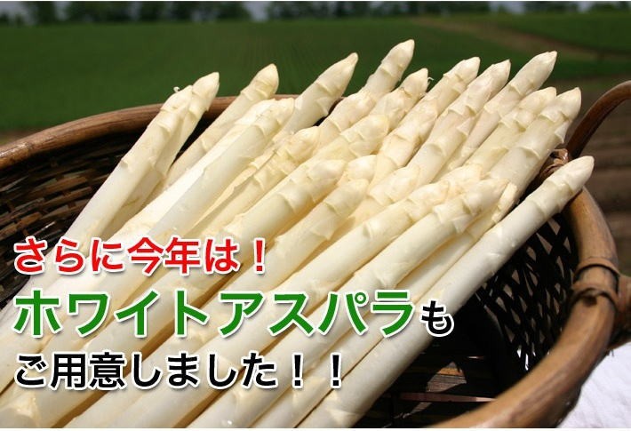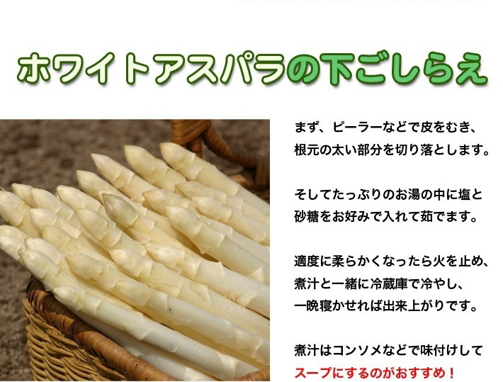 | 保存方法、お召し上がり方 | 保存する時は 縦にして保存してください。鮮度と甘みが保たれます。 はかまを取って根元を濡れ新聞等で包んでおくと、より日持ちします。 また長期に保存される場合は、 下茹でしてパックに入れ、冷凍保存してください。 召し上がる際には、自然解凍してください。 約1ヶ月程の冷凍保存を目安にしてください。 ホワイトアスパラの下ごしらえ ピーラー等で皮をむき、根元を切り落とします。たっぷりのお湯に塩と砂糖をお好みで入れ、適度に柔らかくなるまで茹でます。 柔らかくなったら火を止め、煮汁に入れたまま 自然に冷めるのを待ち、冷めたら煮汁と一緒に 冷蔵庫で一晩寝かせれば下ごしらえは終了です。 煮汁はスープ等にお使いいただいても 美味しく召し上がっていただけます。 |