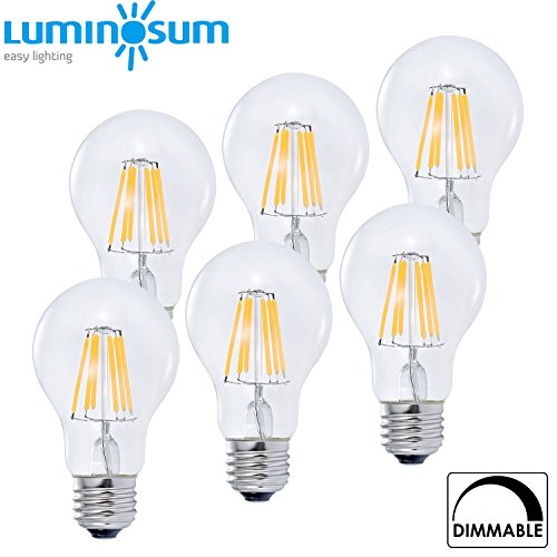 LUMINOSUM LED Filament Bulb Dimmable 6W, 60W Equivalent, Classic Edison Style A19/A60, Standard Screw E26 Base, Soft White 2700K, 6-Pack