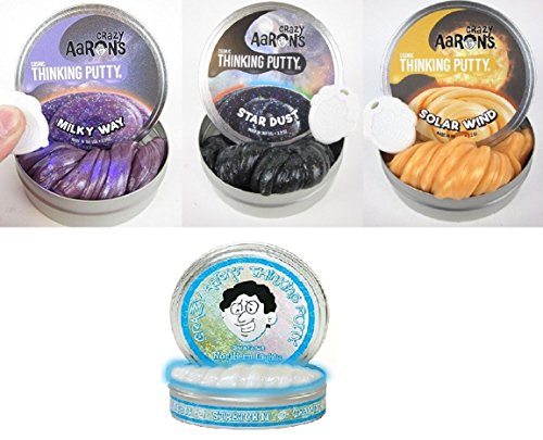-. Binding : Toy -. Brand : Crazy Aaron's -. EAN : 0688943130789 -. Feature : Includes 1 x 3.2 Oz Each, 4" Tin of Milky Way, Northern Lights, Star Dust, Solar Wind / Crazy Aaron's Thinking Putty Cosmics 3.2 Oz 4" Tin 4 Pack / Each Cosmics Thinking Putty Includes a Glow Charger for amazing glow effects that are out of this world. -. IsAdultProduct : 0 -. Label : Crazy Aaron's -. Manufacturer : Crazy Aaron's -. ProductGroup : Toy -. ProductTypeName : TOYS_AND_GAMES -. Publisher : Crazy Aaron's -. Studio : Crazy Aaron's -. Title : Crazy Aaron Thinking Putty Milky Way Northern Lights Star Dust Solar Wind 4" Tin -. UPC : 688943130789