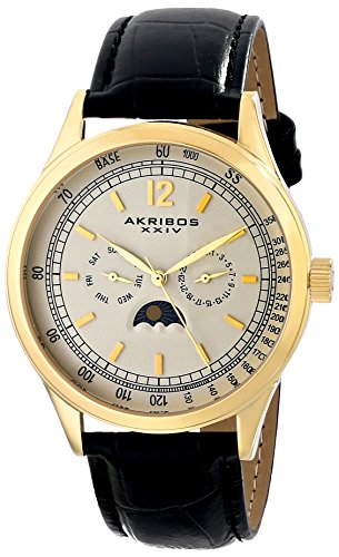 -. Title : Akribos XXIV Men's AK638YG Retro Multi-Function Gold-Tone Stainless Steel Black Leather Strap Watch