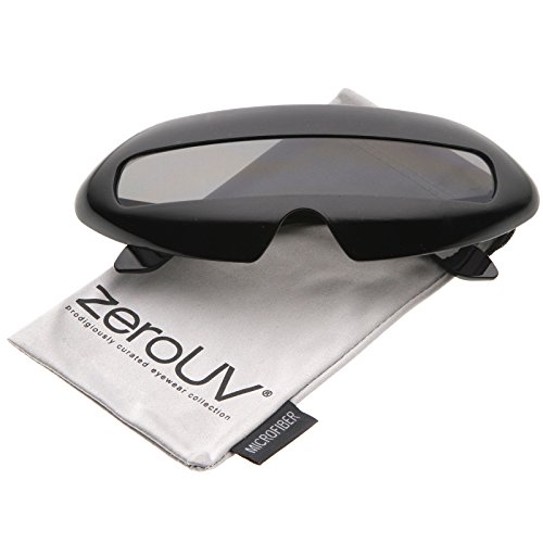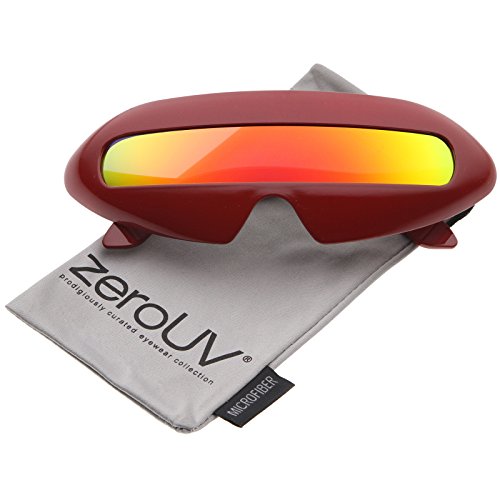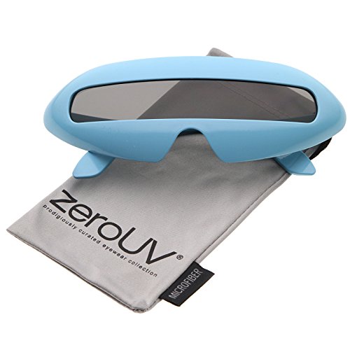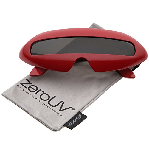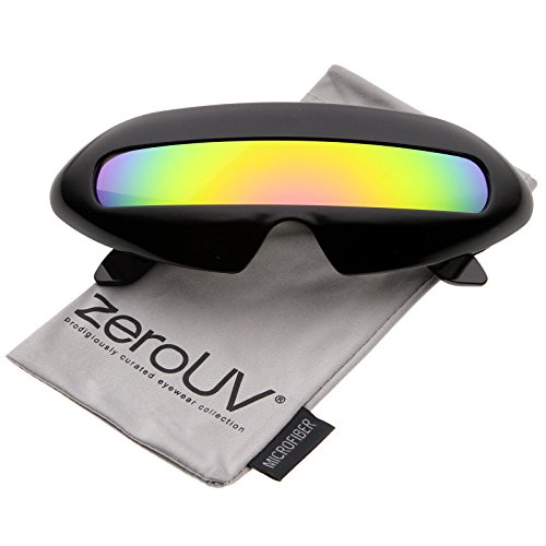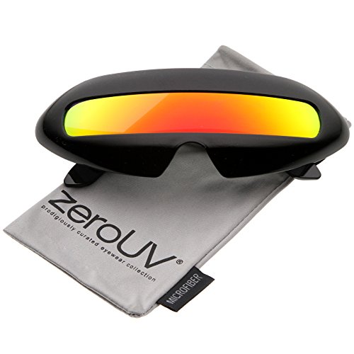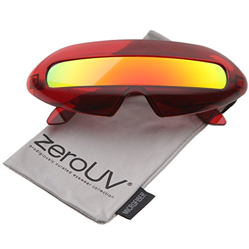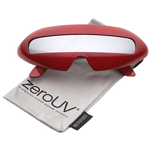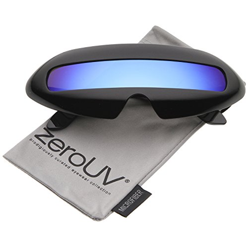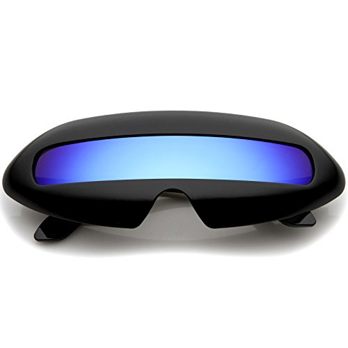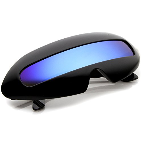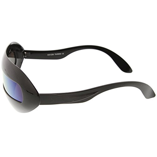 Create an out of this world look with these futuristic inspired sunglasses. Designed with a large wrap around style frame and a single colored mirror shield lens, these bold sunglasses are sure to catch anyone's attention. Complete with a glossy finish and unique curved temples, these shield sunglasses are a great addition to our novelty collection. Perfect for parties or futuristic costumes. Made with a plastic based frame, metal hinges and polycarbonate UV400 protected shield lens. Lens Height: 22 mm | Lens Width: 70 mm | Bridge: 20 mm | Frame Total: 163 mmFeature