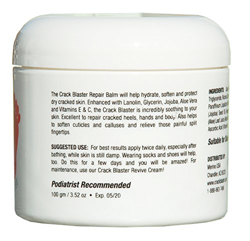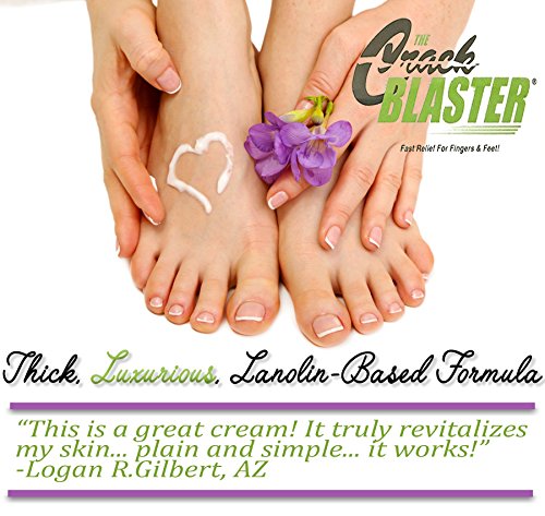 Cracked dry heels? Stubborn dry skin on your hands, fingers and elbows? Make them a thing of the past with The CRACK BLASTER heel crack repair. Offers fast relief for feet, fingers, callouses and more! Our cracked heel dry hand treatment is a multi purpose foot balm that helps to repair and protect extremely dry skin cracked skin. Also works wonders as a dry elbow treatment. Simply apply a small amount to elbows, heels, feet, and all other sensitive dry spots and begin the healing process (a little goes a long way)! For best results use twice a day. You will be amazed at how quickly your heels soften and look like new again. Pain relief from cracks in the fingers will blow you away. This product can be used by the whole family! Men love it, too! Ingredients: Purified Lanolin, Glycerin, Jojoba, Aloe Vera, Vitamin E and Vit. C Directions: Warm a small bit first between fingertips and apply as required to dry or cracked skin. Twice daily for fast results. 0