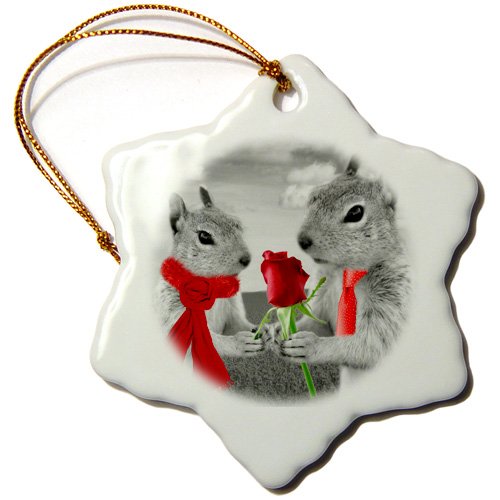 3dRose orn_101826_1 Squirrel Couple in Love with Red Rose Black and White Photograph-Snowflake Ornament, 3-Inch, Porcelain