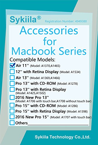 -. Feature : Friendly Note:The case only fit for Macbook Air 11 Inch Model: A1370 / A1465. Please find the Macbook's model number at the bottom to determine compatibility (Like the second picture shown). If you buy a wrong model,please keep package original and apply for return. / Use professional UV printing machine to print the picture.The picture is glossy,waterproof,fadeless.Long service life. / Protect your Macbook from accidental hard knocks and scratches.Have enough vents for heat release,Fully access to all buttons and features. Plug your charger,cable or headset without removing the case. / Package includes: 1 set hard case (Top and bottom),1 TPU keyboard cover, 1 screen protector film,1 vinyl decal.All products come with Sykiila original package. / Sykiila is a registered trademark of Sykiila Tech Company.Sykiila Tech provides 12-month warranty for hard case and free lifetime technical support for all Sykiila products.Please buy from Sykiila Tech to make sure you can get original products and warranty.