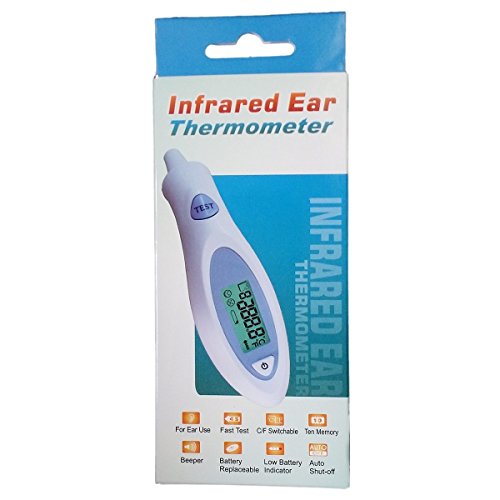 Studio : Sejoy Publisher : Sejoy Binding : Health and Beauty Product Description Ideal for babies and adults, Ben Belle ® digital infrared ear thermometer provides accurate and fast temperature readings from the ear over the range of 32.0 to 43.0 degree C. The ear thermometer is portable and easy to use with large digital backlight LCD display,which the backlight will keep about 2 seconds, and restore nature, but push the power button, it can back to the backlight, and also can check the record. The digital thermometer is a device capable of measuring the people's body temperature by dectecting the intensity of infrared light emitted from the ear canal of human. It converts the measured heart into a temperature reading displayed on the LCD. The temperture thermometer incorporates a memory recall function - last nine readings. The temperature thermometer is powered by a CR2032 lithium coin cell battery (supplied).