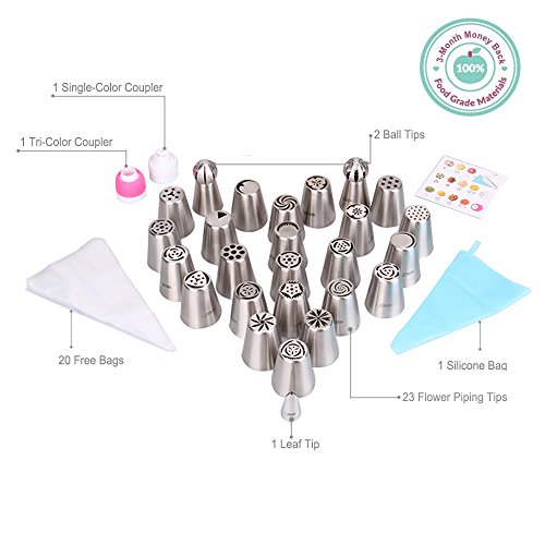 - ❤❤ Buy 2 or more flower icing tips set offered by us and get 1 of them free. Enter code Q5NYDXKA at checkout.❤❤ Multiple Choice: NOSIVA icing tips provide you 26 different professional piping tips to choose, including 23 shining flower tips, 1 leaf tip, 2 ball tips, 1 single-color coupler, 1 tri-color coupler. Choose your favorite one when making colorful cupcakes!