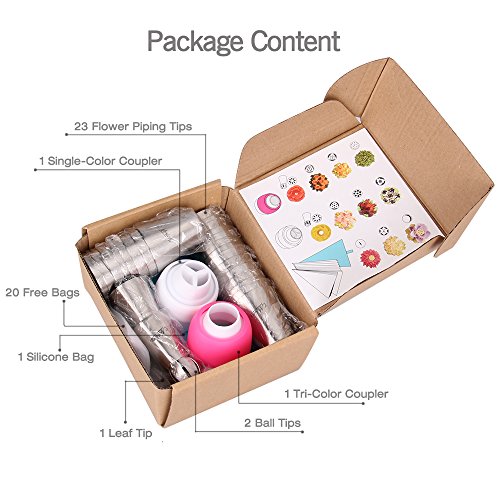 NOSIVA Icing Tips Stainless Steel Piping Nozzles, 26 Cupcake Decoration Icing Tips, 2 Free Piping Couplers, 20 Piping Bags With 1 Extra Silicone Bag Baking DIY Tools