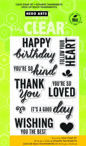 -. Binding : Misc. -. Brand : Hero Arts -. EAN : 0085700896955 -. Feature : Just peel, stick and stamp on paper! / See-through stamps ensure precise placement / Stamps like rubber for crisp, clear impressions / Each design is a Hero Arts original / Made with premium-quality photopolymer in the USA -. Label : Hero Arts -. Manufacturer : Hero Arts -. Model : CL748 -. MPN : CL748 -. PackageQuantity : 1 -. PartNumber : CL748 -. ProductGroup : Art and Craft Supply -. ProductTypeName : HOME -. Publisher : Hero Arts -. Studio : Hero Arts -. Title : Hero Arts You're So Kind Clear Stamp Set -. UPC : 085700896955