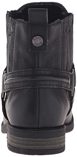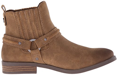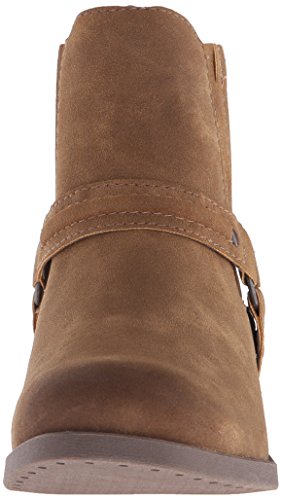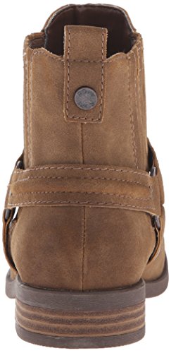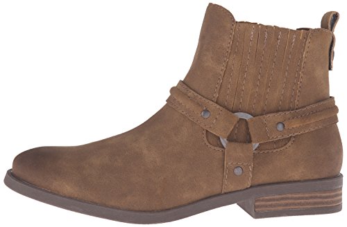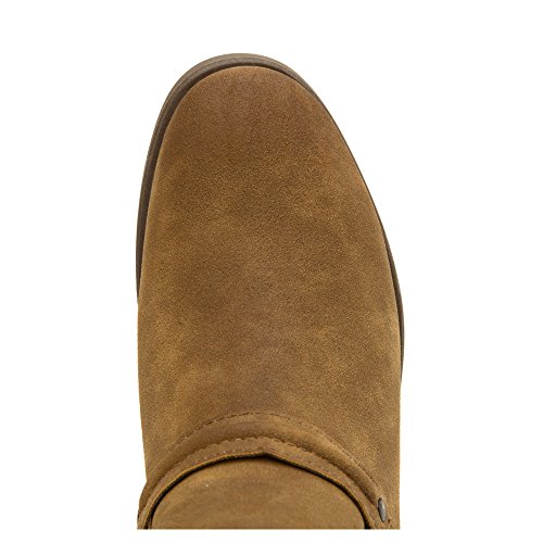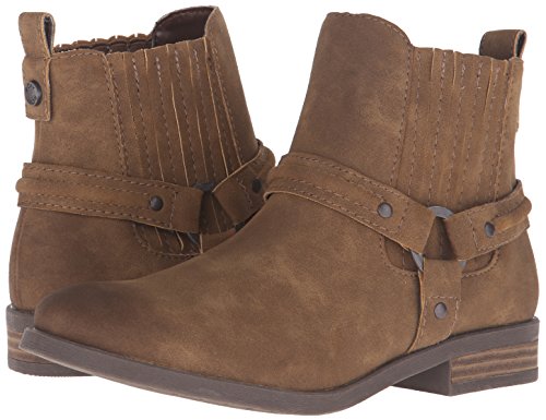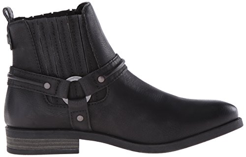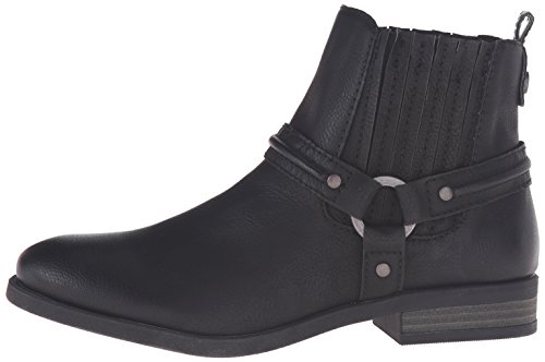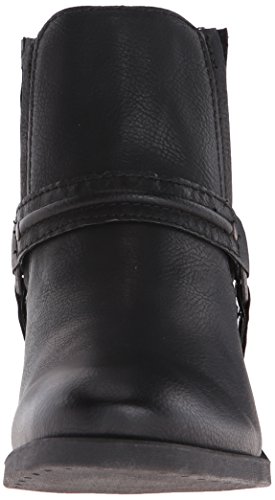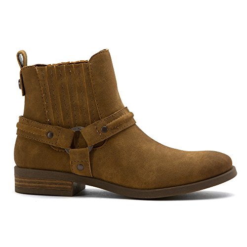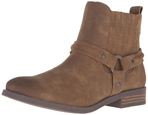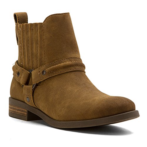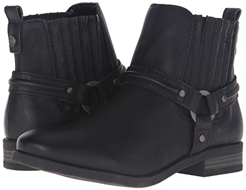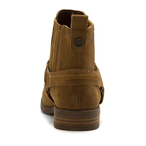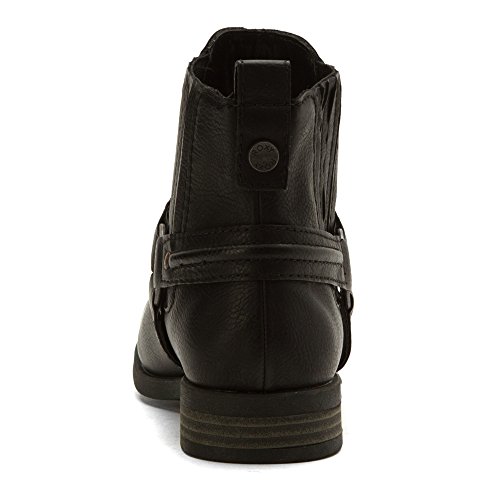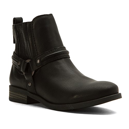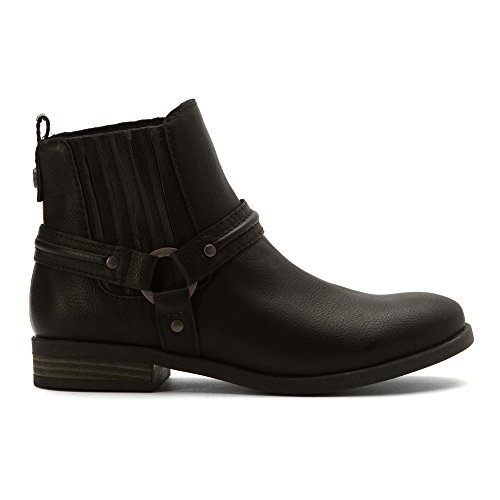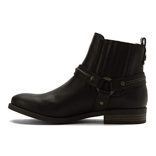 Product DescriptionMoto bootie with harness style strap and metal ring detail, synthetic covered elastic gore, canvas lined shaft and footbed, and flexible tpr injected outsole.0