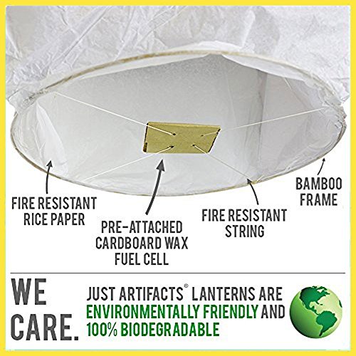 We also carry specialty flying sky lanterns, such as patterned sky lanterns with holiday or sports themes and jumbo sky lanterns that impress your guests in a big way. All the floating Sky Lanterns that Just Artifacts® sell comes with their own fuel cells that are attached. Our Sky Lanterns are made of fire resistant paper and biodegradable material (Rice Paper) to ensure a clean and safe environment. Shop our selection of flying Chinese lanterns and let them get your party off the ground! We wish you have a wonderful party. 0