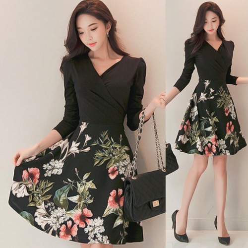 商品名:カシュクールワンピース バイカラー セクシー 膝丈 花柄 フラワー