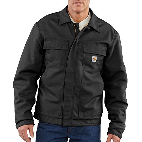 Studio : Carhartt Sportswear - Mens Publisher : Carhartt Sportswear - Mens Binding : Apparel Product Description Carhartt's flame-resistant lanyard access jacket features a fall-protection feature for Carhartt's safety. Made of 8.5-ounce FR canvas, a blend of 88% cotton and 12% high-tenacity nylon, it has a 6.75-ounce FR quilt lining and a flapped back which allows a lanyard to pass through and attach to a safety harness. It features a pleated bi-swing back for ease of movement, two chest pockets with flaps and hook-and-loop closures, two large lower front pockets, two inside patch pockets with FR hook-and-loop closures and inner sleeve Nomex rib-knit storm cuffs. It also has adjustable hook-and-loop cuffs that cinch tight to fit under work gloves, a brass zipper front with Nomex tape plus inside and outside protective flaps with hook-and-loop closures for electric arc protection. Under-collar snaps for optional FR hood (FRA002). NFPA compliant. 8.5-ounce FR canvas, a blend of 88% cotton and 12% high-tenacity nylon Adjustable hook-and-loop cuffs cinch tight to fit under work gloves Flapped back which allows attachment to safety harness 0