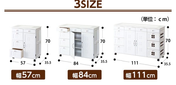 ・サイズは幅57cm、幅84cm、幅111cmの3種類。キッチンのスペースや収納量に合わせてお選びください。