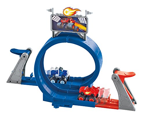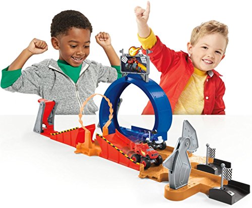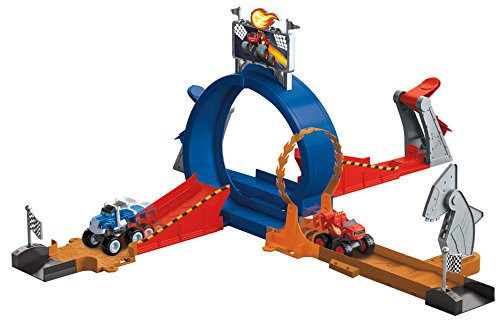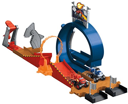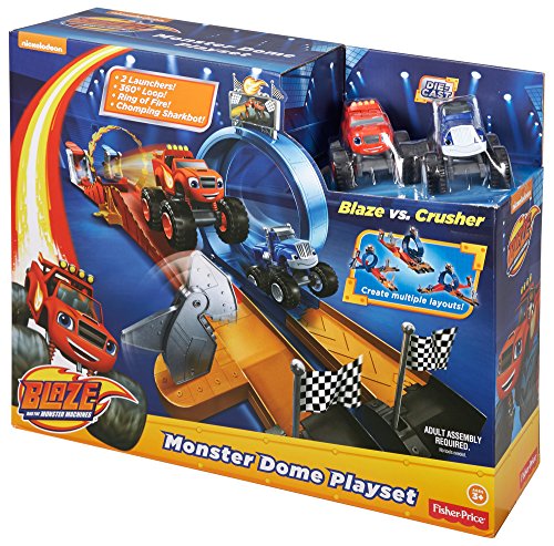 - Feature : Blaze fans will love recreating Race Day at the Monster Dome! / This track set can be configured and customized into multiple layouts! / Create a side-by-side race between Blaze and Crusher! / Two launchers send your Monster Machines speeding around the track and into spectacular stunts! / Launch through the ring of fire and speed past the chomping Sharkbot!
