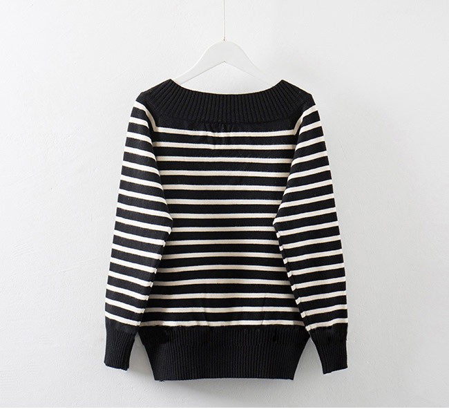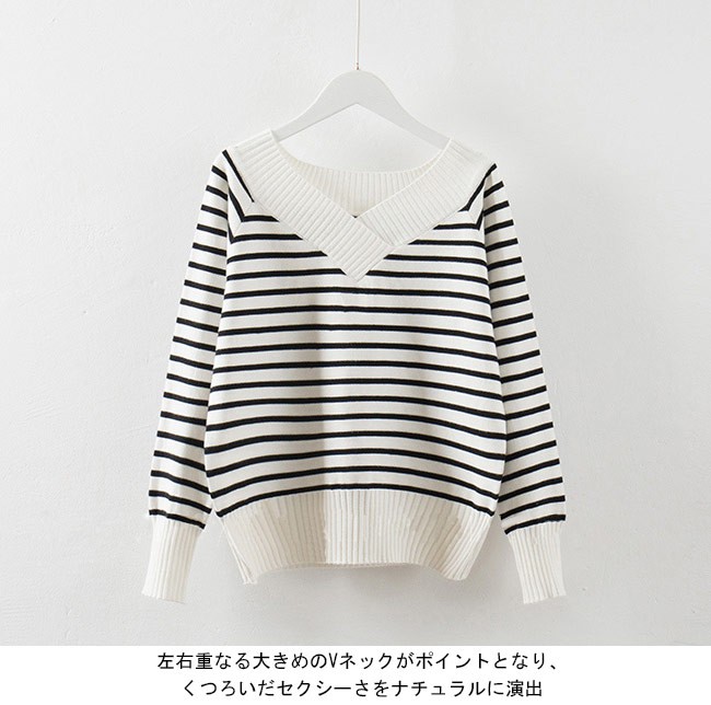 レディース用のニットセーターが登場 シンプルなシルエットにマリン風のボーダー柄というクラシックな組み合わせを取る 左右重なる大きめのVネックがポイントとなり、くつろいだセクシーさをナチュラルに演出 そのまま着てもよい、インナーとして上着やボトムスとのコーディネートも十分楽しめる | |