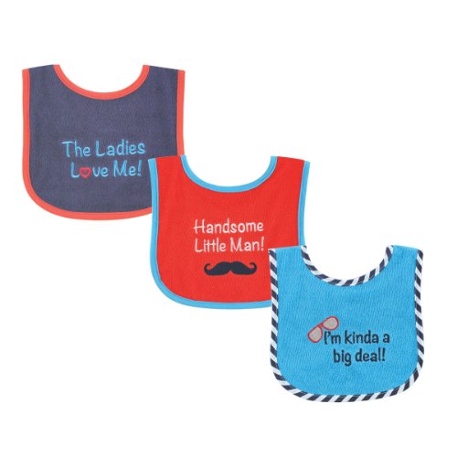 Luvable Friends is the baby bib brand of choice for moms because of our quality products and low prices. Our assortment includes droller bibs, feeder bibs, PEVA bibs, and burp cloths. Luvable Friends Droller Bibs 3-Pack are ideal for preventing meal-time messes. Soft, absorbent fabric on the front, and a water-proof backing helps keep baby's clothes clean. These bibs feature cute embroidered sayings. Bib Measures 6.0 x 7.5 inches from neck down. Available in boy and girl designs.Feature