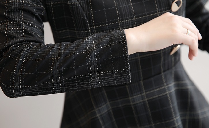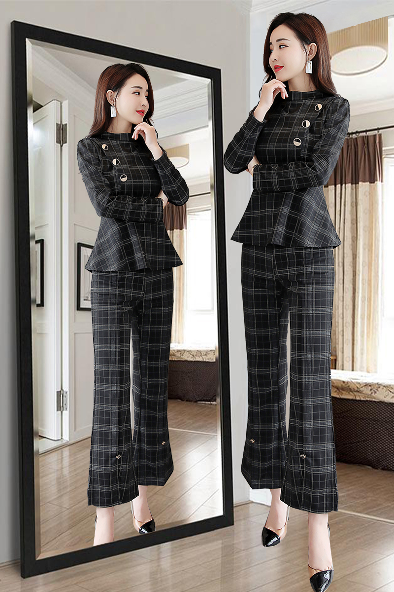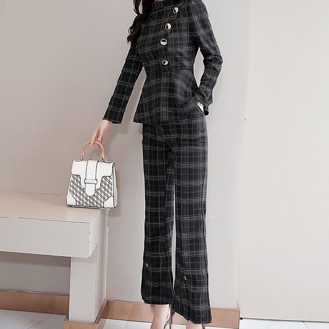 トップスのぺプラムシルエットとボタンディテールが女性らしいデザイン。