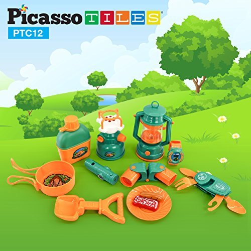 -. Title : PicassoTiles¨ PTC12 12 Piece Camping Gear Tools Adventure Set including Binoculars, Watch, Thermometer, Compass & Whistle, Stove, Toy Oil Lamp, Toy Gas Stove, and Other Camp Tools