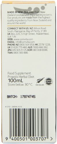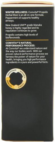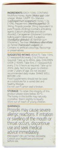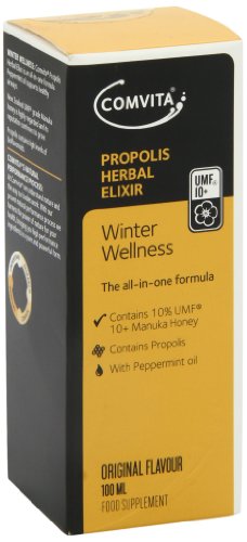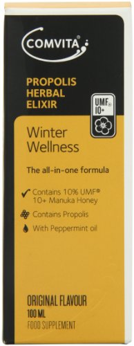 Comvita® Propolis-Kräuter-Elixir besteht aus einer natürlichen Rezeptur. Comvita® Propolis-Kräuter-Elixir nutzt die Synergieeffekte von UMF®10+ Manuka-Honig, Propolis und sorgfältig ausgewählten Kräuterauszügen.INGREDIENTSBlütenhonig, Apfelcideressig, Wasser, UMF®10+ Manuka-Honig, Pfefferminzöl, Propolispulver, Kalziumphosphat und Siliziumdioxid (Rieselhilfsmittel), Carrageenan (Verdickungsmittel), Dextrose, Eukalyptusöl, Xanthan, Teebaumöl, Fenchelöl. Ohne künstliche Farb- und Aromastoffe oder Konservierungsmittel.VERWENDUNGSEMPFEHLUNGENErwachsene: Je nach Bedarf alle 2 - 3 Stunden 10 ml (2 Teelöffel) einnehmen. Nicht mehr als 40 ml pro Tag einnehmen. Kann mit warmen Wasser als Getränk vermischt werden. Kinder: Je nach Bedarf alle 2 - 3 Stunden 5ml (1 Teelöffel) einnehmen. Nicht mehr als 20 ml pro Tag einnehmen. Mit warmem Wasser verdünnen und bei Bedarf mit Honig süßen. Nicht Kindern unter 2 Jahren geben. Nicht mehr als empfohlene Höchstmenge pro Tag zu sich nehmen. Nicht verwenden, wenn das Deckelsiegel bereits beschädigt ist.WARNHINWEISE: Propolis kann starke allergische Reaktionen hervorrufen. Falls eine Reizung oder Schwellung im Mund- oder Rachenraum auftritt, die Verwendung beenden und unverzüglich einen Arzt oder Apotheker aufsuchen.