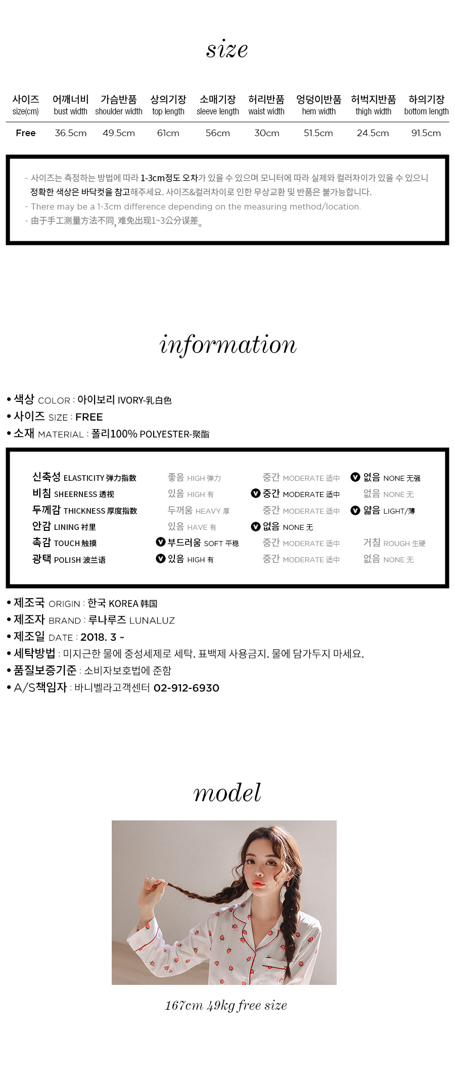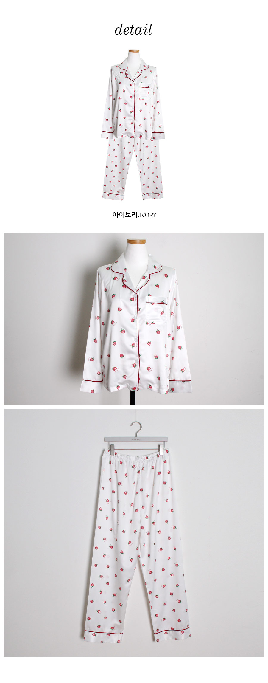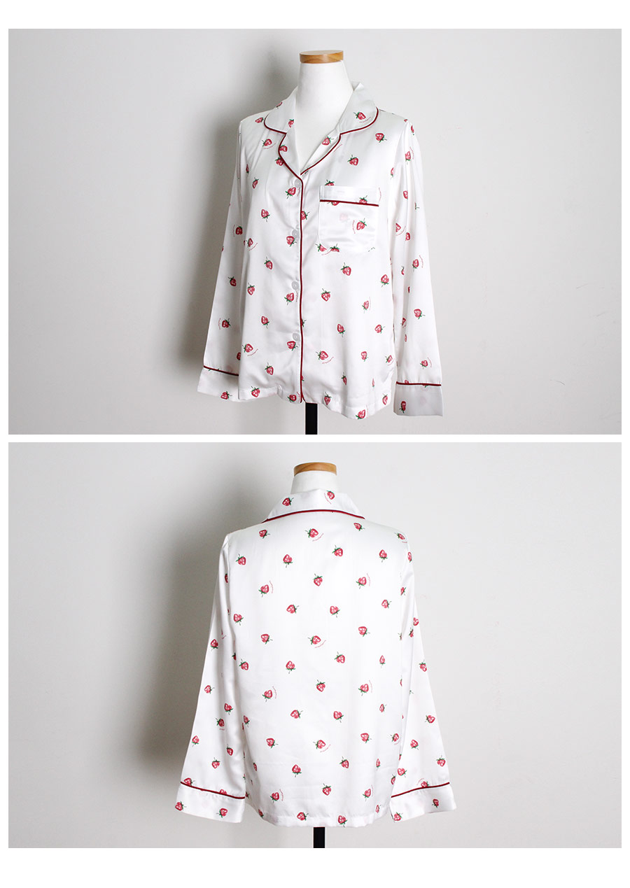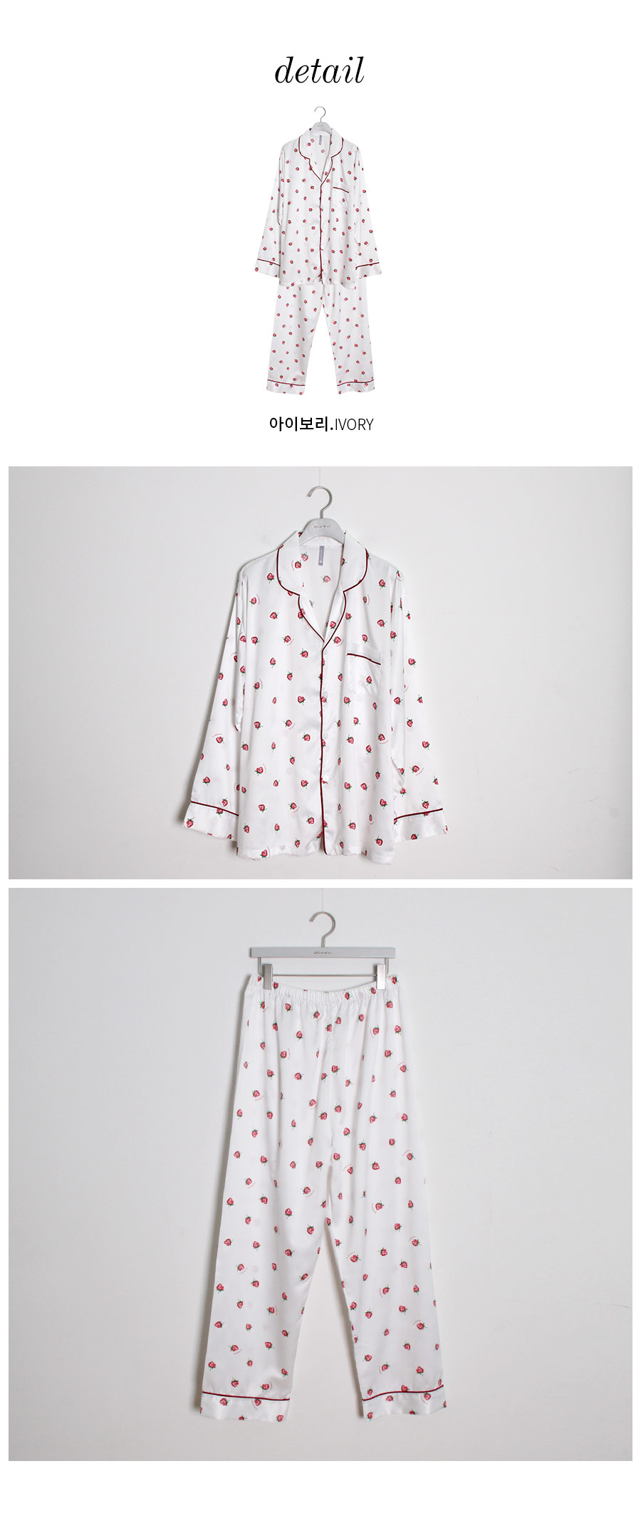 S/S시즌에 걸맞는 컬러감과 아기자기한 딸기, dty소재가 매력적인 커플잠옷! 매끄러우면서 고급스러운 광택이 흐르는 소재와 직접 그린듯한 딸기가 러블리한 무드를 내어주는 커플 잠옷입니다. 실키하게 떨어지는 부드러운 광택, 터칭감, 실루엣까지 정말 예뻐요. 일반 샤무즈 원단과는 달리 DTY 원사로 제작한 소재라 훨씬 더 고급스러우며 부드러운 광택이 도는 잠옷입니다. 필링이 발생하지 않고 타 원단에 비해 세탁과 내구성 면에서도 좋습니다. 무엇보다 고급스럽고 네츄럴한 광택, 탄탄함이 잘 어우러진 프리미엄 잠옷이라고 볼 수 있어요. 피부가 예민하신 분들도 착용하기 좋은 부드러운 촉감이며 바디에 예쁘게 떨어지는 패턴으로 매력적으로 연출하실 수 있습니다. 여러번 bt 수정을 거친 예쁜 색감의 잠옷으로 강력 추천해드리고 싶습니다. 소프트한 아이보리컬러 1가지로 환하고 화사해 보이는 파자마세트입니다~! DETAIL 바디에 예쁘게 떨어지는 깔끔한 파자마셔츠 스타일, 포켓 파이핑 카라 디자인으로 매력적으로 연출하실 수 있습니다. 소재와 컬러, 패턴, 봉제까지 까다롭게 제작한 잠옷으로 입었을 때 더 만족해 하실 거에요. 카라의 끝 부분과 포켓, 소매와 팬츠의 하단에 파이핑을 둘러 봉제해 포인트를 주었습니다. 100%국내 제작으로 원단, 디자인, 봉제의 퀄리티가 높습니다. SIZE 남성 잠옷은 100size 기준으로 제작한 free사이즈 입니다. 여성 잠옷은 44반size~55반size까지 착용가능한 free 사이즈입니다.