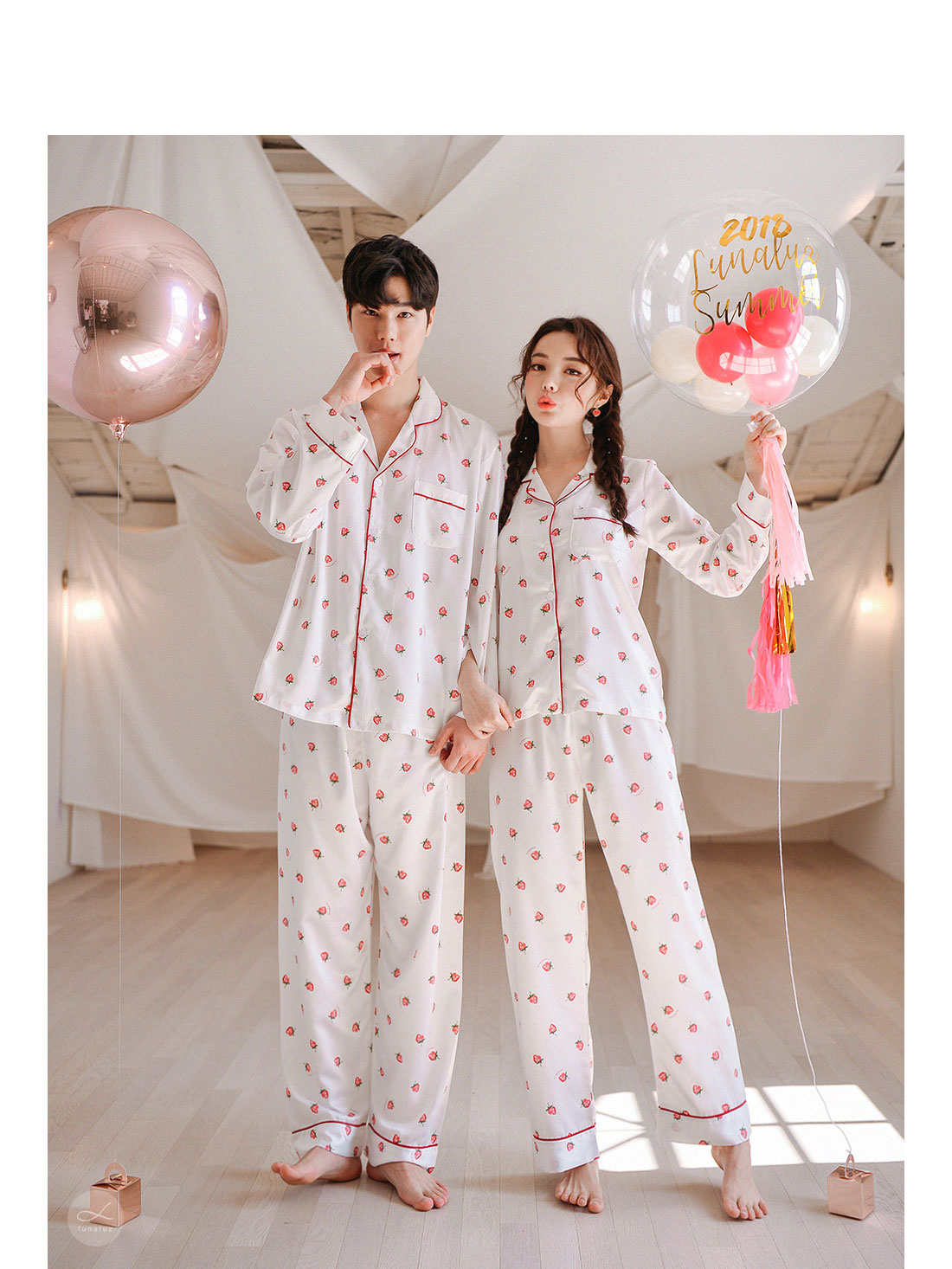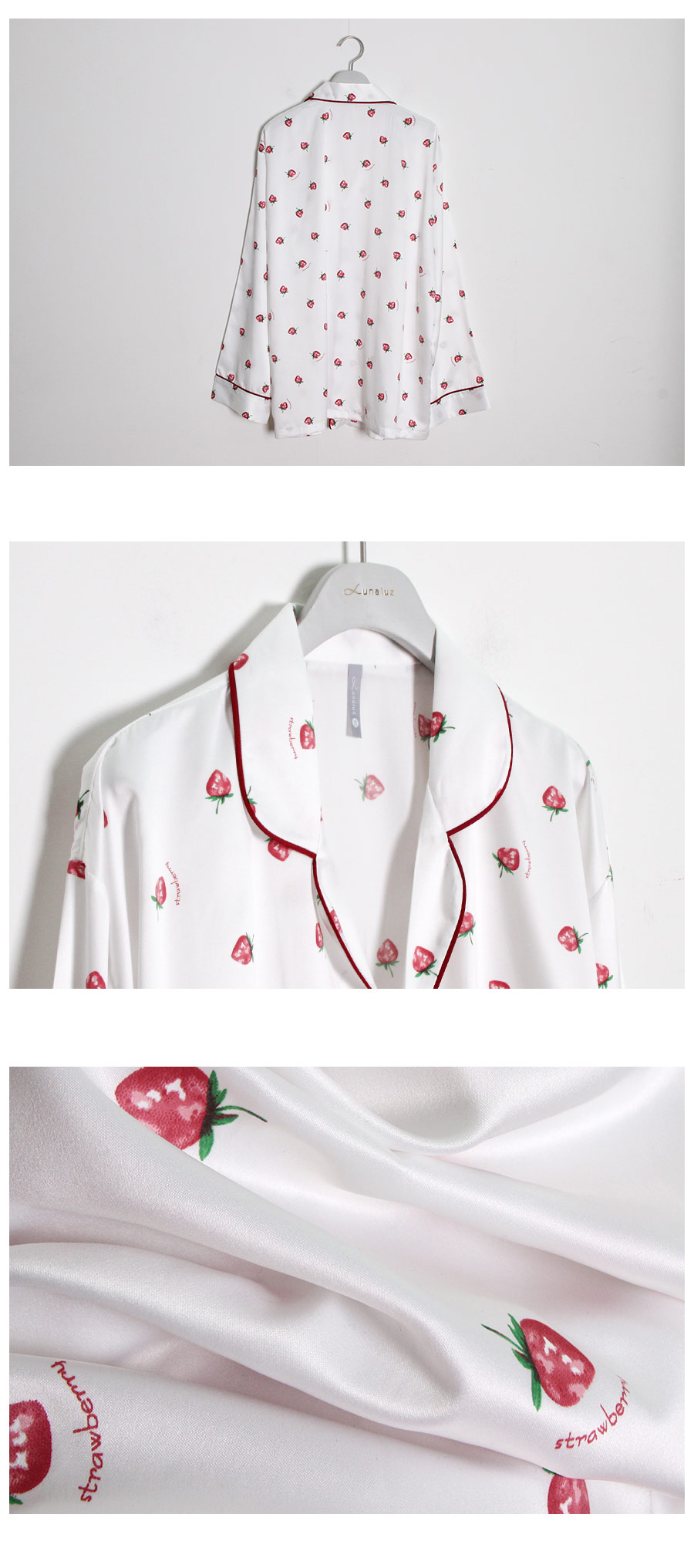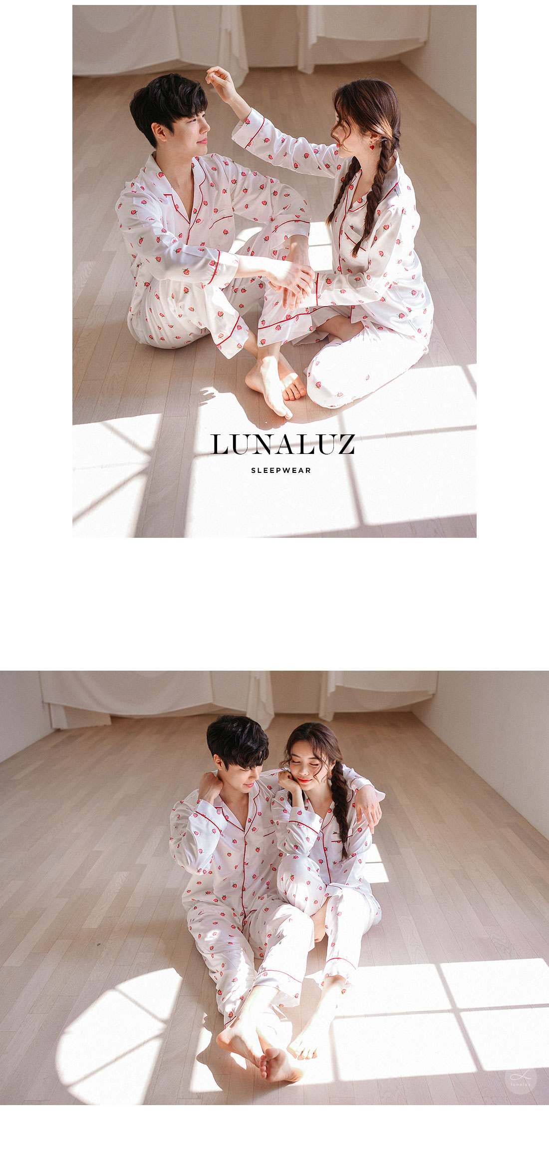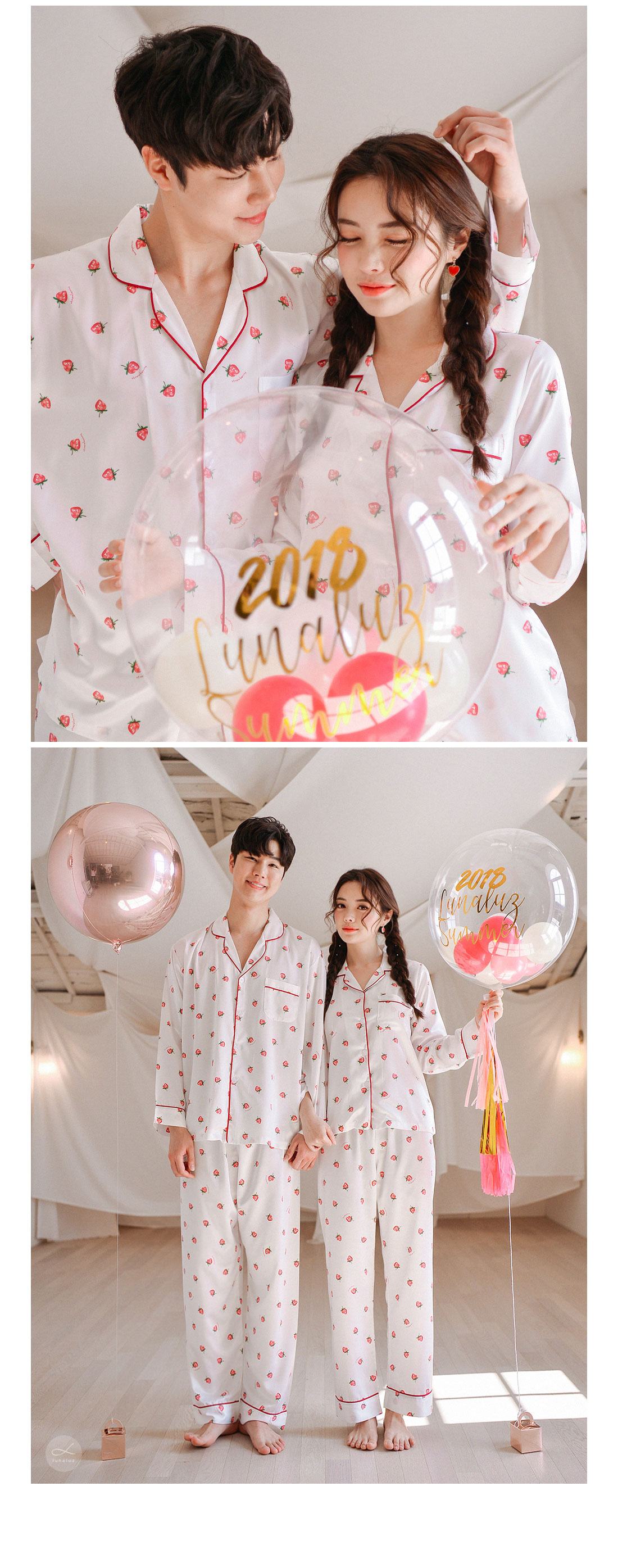 S/S시즌에 걸맞는 컬러감과 아기자기한 딸기, dty소재가 매력적인 커플잠옷! 매끄러우면서 고급스러운 광택이 흐르는 소재와 직접 그린듯한 딸기가 러블리한 무드를 내어주는 커플 잠옷입니다. 실키하게 떨어지는 부드러운 광택, 터칭감, 실루엣까지 정말 예뻐요. 일반 샤무즈 원단과는 달리 DTY 원사로 제작한 소재라 훨씬 더 고급스러우며 부드러운 광택이 도는 잠옷입니다. 필링이 발생하지 않고 타 원단에 비해 세탁과 내구성 면에서도 좋습니다. 무엇보다 고급스럽고 네츄럴한 광택, 탄탄함이 잘 어우러진 프리미엄 잠옷이라고 볼 수 있어요. 피부가 예민하신 분들도 착용하기 좋은 부드러운 촉감이며 바디에 예쁘게 떨어지는 패턴으로 매력적으로 연출하실 수 있습니다. 여러번 bt 수정을 거친 예쁜 색감의 잠옷으로 강력 추천해드리고 싶습니다. 소프트한 아이보리컬러 1가지로 환하고 화사해 보이는 파자마세트입니다~! DETAIL 바디에 예쁘게 떨어지는 깔끔한 파자마셔츠 스타일, 포켓 파이핑 카라 디자인으로 매력적으로 연출하실 수 있습니다. 소재와 컬러, 패턴, 봉제까지 까다롭게 제작한 잠옷으로 입었을 때 더 만족해 하실 거에요. 카라의 끝 부분과 포켓, 소매와 팬츠의 하단에 파이핑을 둘러 봉제해 포인트를 주었습니다. 100%국내 제작으로 원단, 디자인, 봉제의 퀄리티가 높습니다. SIZE 남성 잠옷은 100size 기준으로 제작한 free사이즈 입니다. 여성 잠옷은 44반size~55반size까지 착용가능한 free 사이즈입니다.