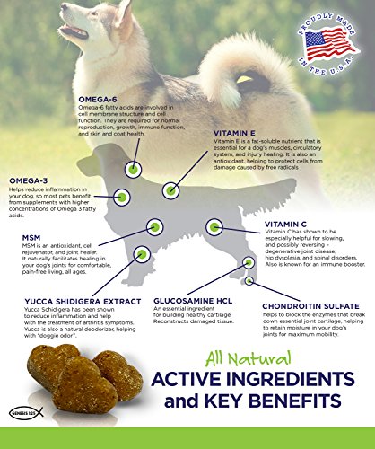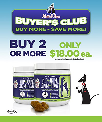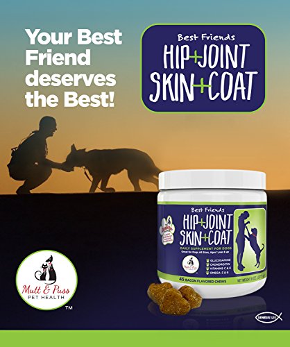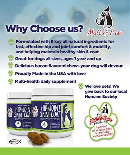 -. Feature : BUY 2 OR MORE FOR $18 EACH - RELIEVES JOINT PAIN & IMPROVES MOBILITY - Mutt and Puss created a powerful formula of Glucosamine Chondroitin, MSN and Yucca for dogs chews work to cushion and lubricate joints and ease your dog's discomfort from aging, injury, arthritis pain and hip dysplasia. Our nutritional supplements for dogs helps increase mobility, improve flexibility and support and repair torn cartilage. / ODOR CONTROL, HEALTHIER SHINIER COAT & CLEARER SKIN - Help your pet's DRY, ITCHY, SMELLY SKIN from the inside out! Most skin issues can't be taken care of with shampoos and conditioners alone. Give your pet a soft chew TREAT that will give him a odor free, shine and healthy coat and treat his skin and coat at the source! Mutt and Puss created this formula to be the best supplement for dogs with dry skin. / WE PROVIDE THE BEST CUSTOMER SERVICE You and your dog's happiness are our top P.R.Iority. If for any reason you are not happy with Best Friends, we'll provide you with a full refund and ensure we resolve any issue to your complete satisfaction. / PROUDLY MADE IN THE USA, FDA REGISTERED FACTORY, INSPECTED ANNUALLY BY APHIS, CERTIFIED SAFE BY AN INDEPENDENT LAB: Dogs of all sizes love our hip and joint supplement, and owners are seeing results. Stop wasting time and money on hip and joint supplements that don't work. Order Best Friends now, RISK FREE! / VETERINARIAN FORMULATED, 100% NATURAL AND SAFE, MADE IN USA - We carefully selected these ingredients to offer the best hip, joint + coat supplement for all dogs to enjoy peak mobility and comfort - our custom-designed chews are a powerful solution! Made in USA at FDA and cGMP-compliant facility.