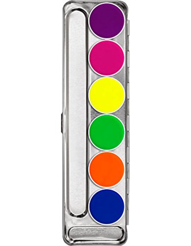 Aquacolor UV-Dayglow is a fat-free water color. With a pigment content of ca. 50%. Aquacolor UV-Dayglow is specially color intensive and glows already under normal light conditions. It is universally applicable, for example, clothing, shoes, for baldness effects and masks to achieve special lighting effects under black light. Application is effortless, with an only slightly moistened make-up sponge or brush. After drying, it can be gently buffed with a soft towel. Setting Spray is recommended if the make-up will be subjected to extreme conditions. Aquacolor is extensively smudge-proof and can be easily removed with soap and water. These used special fluorescent pigments are intended for special effects and are not colors in the sense of the German and European Regulation of the European Parliament and of the Council. These products are not intended for cosmetic use, but have been successfully tested in a university hospital for their safety.Feature